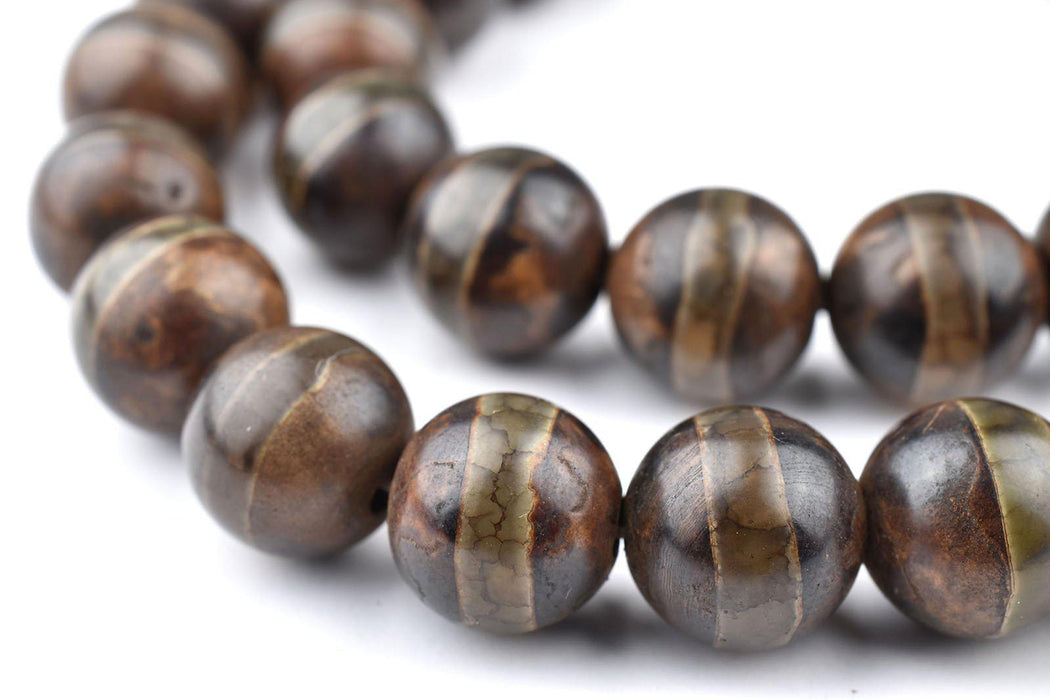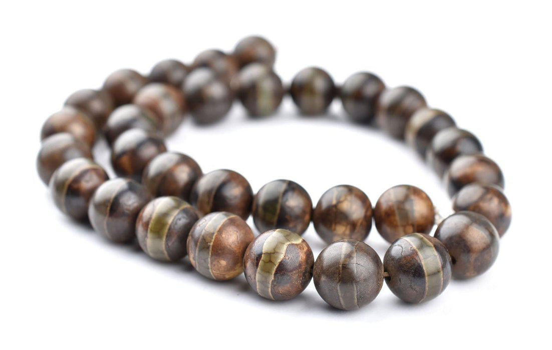 Take a look at these hand-patterned Tibetan agate beads. The special character of this stone bead is apparent by the unique translucence of the beads. Each of these beautiful round beads measures approximately 12 x 12mm. Each strand may show slight variation in color and pattern.