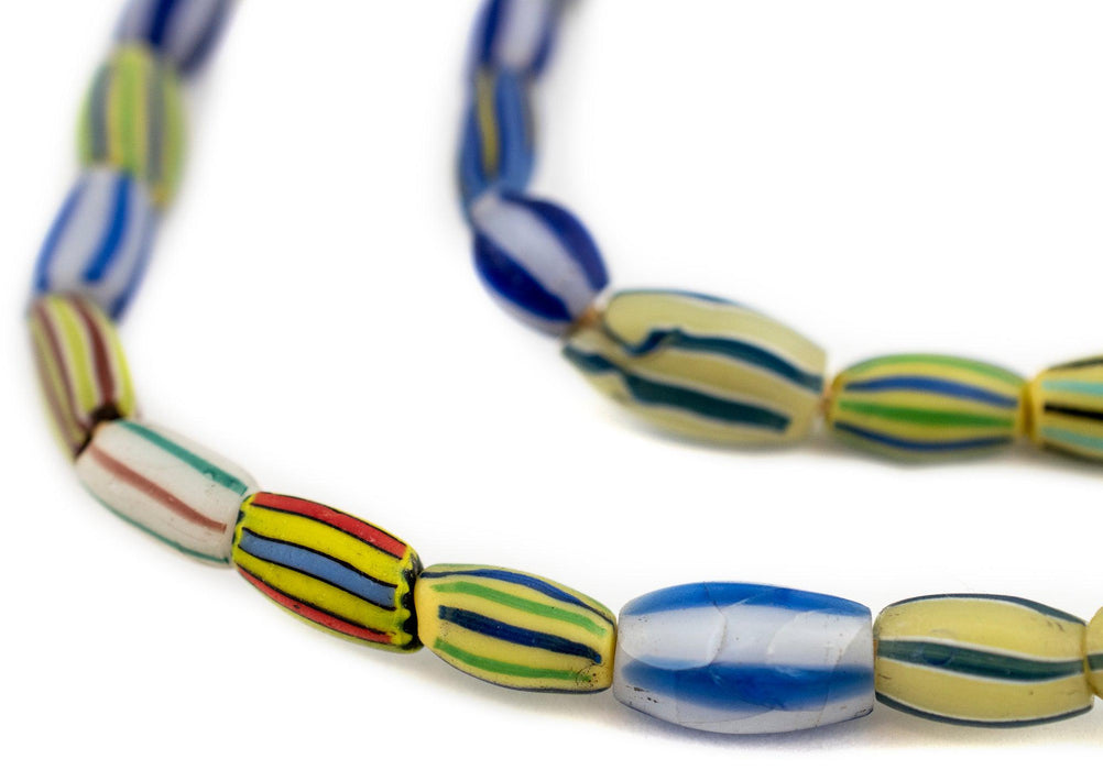 Checkout these beautiful Venetian trade beads, known as watermelon chevron. Similar to the commonly known Chevrons, they display a colorful set of stripes on each bead. The strand measures approximately 24", and each bead measures approximately 6-16 x 5-9mm. Due to age, some beads may be chipped or damaged. Some beads may be more flat while others may be more oval.
