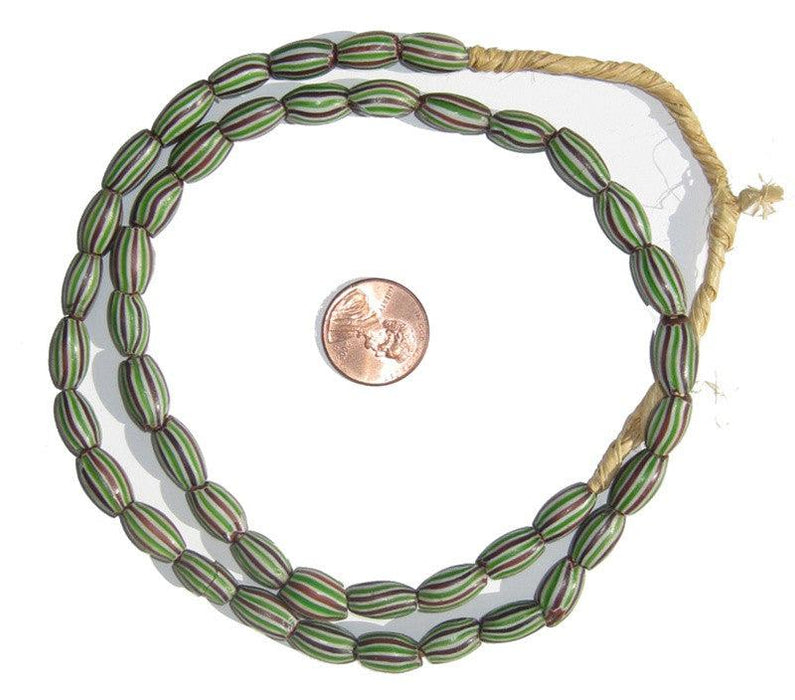 Checkout these beautiful chevron trade beads, known as watermelon chevron. Similar to the commonly known Chevrons, they display a colorful set of stripes on each bead. The strand measures 24", and each bead is approximately 12 - 15 mm in length by 6-7 mm in diameter. Due to age, some beads may be chipped or damaged. Some beads may be more flat while others may be more oval. Please inquire if you have specific needs.