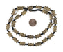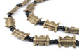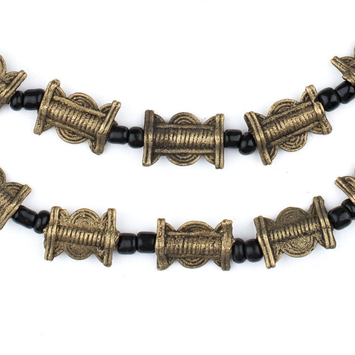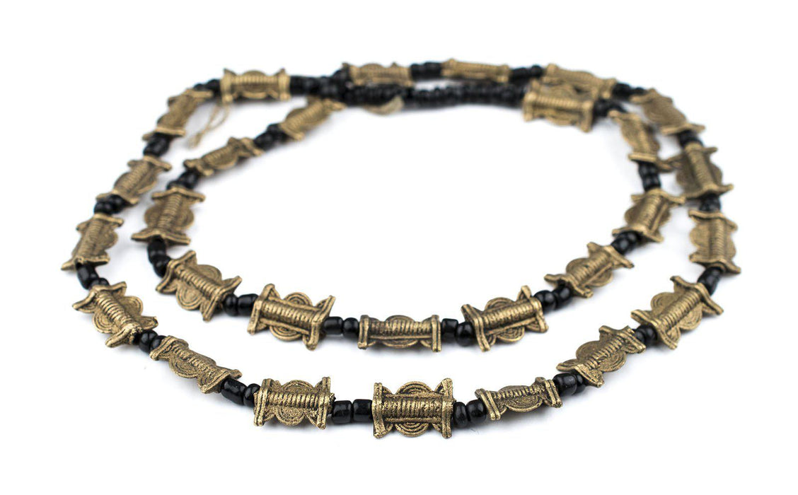This beautiful strand of ethnic brass beads was made by independent artisans from the Baule tribe in Ivory Coast. Brass beads such as these are created in traditional motifs and used as an integral part of Baule culture. Each bead measures approximately 15x11mm, with a hole size of 2mm. Some strands may not have small glass spacers. Color of glass spacer beads may vary. Another great strand for your collection!