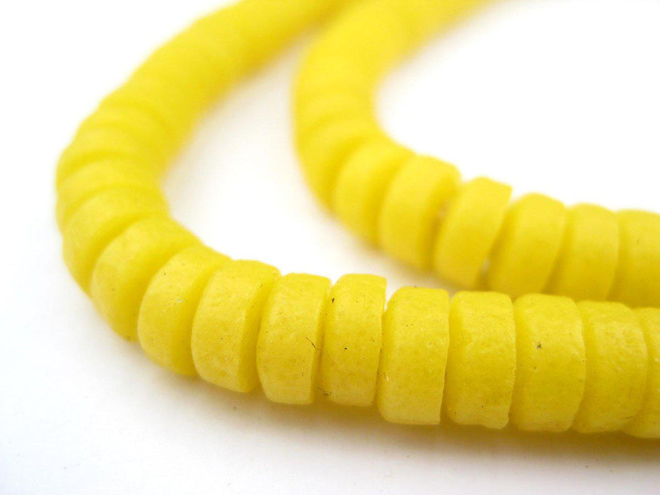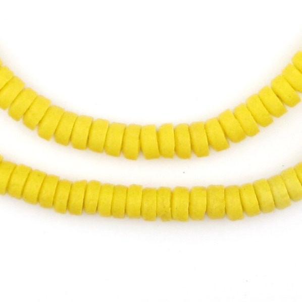 Checkout this beautiful strand of yellow color Ghana glass disk beads. The process of making these beads is unique to Africa and has been used for over 1000 years. Pulverized glass of various colors is poured into a clay mold, using a cassava stem for the bead's hole. The mold is placed in a furnace and heated until the glass particles congeal without actually melting and the stem burns out. The Ghanaians have been making beads in this manner since the 1600s. Each bead measures approximately 3.5 x 7-9mm, with holes measuring approximately 2mm.