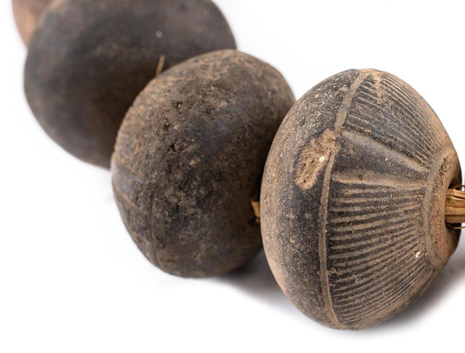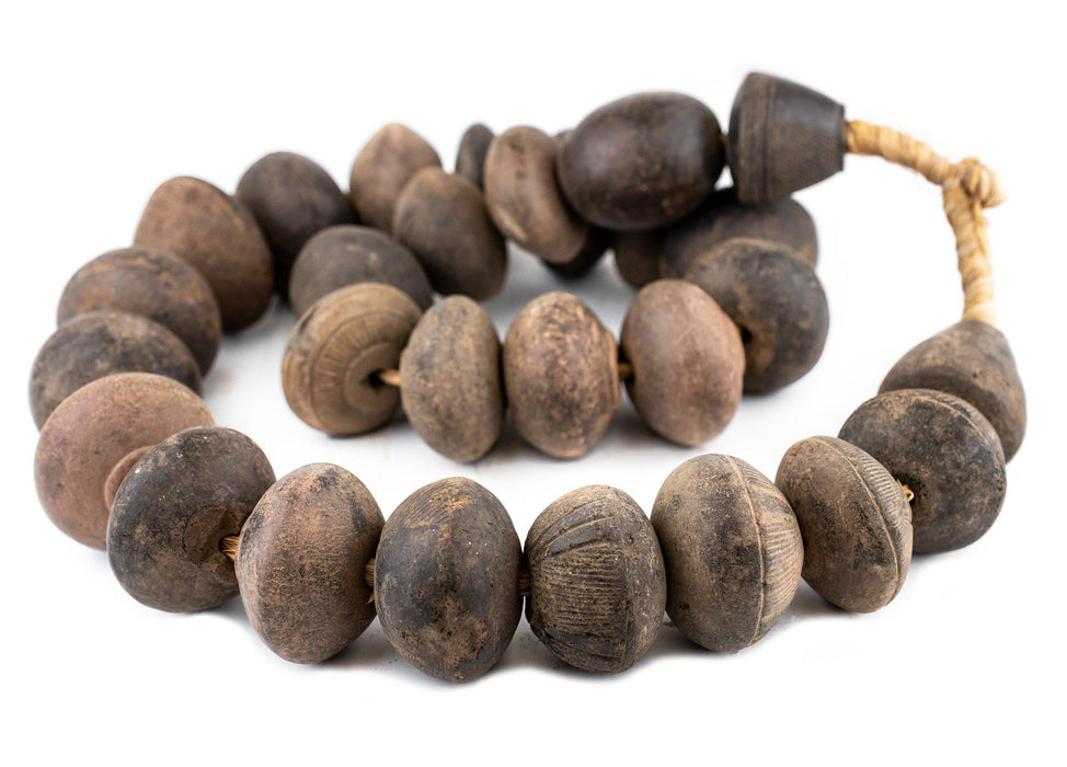 This authentic strand of antique clay spindle beads is from Nigeria, West Africa. These are original spindle beads that were used as apart of a loom to weave traditional textiles by hand. The exceptional size and quality of these beads is uncommon with individual beads measuring 36-55mm in diameter. You will receive the unique strand pictured. Use them as a wall hanging or as an adornment for a special room. Use them as centerpiece beads or even wear "as-is" but be advised, at 1.84kg, they are heavy! Additional shipping will apply for international destinations.