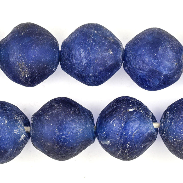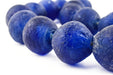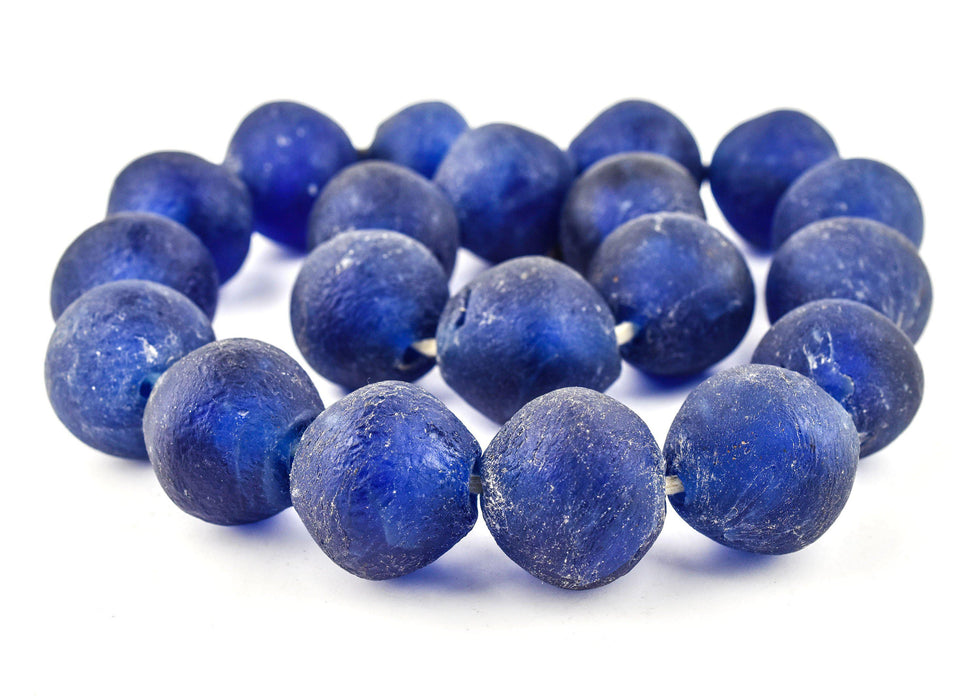 Take a look at this exceptionally large strand of jumbo-sized blue recycled glass beads. Large beads such as these are hard to find and even harder to find in good condition. The journey from Africa can sometimes be unkind to such large beads! This strand is sure to make an impression wherever it goes. Use these beads as centerpieces for special jewelry, as adornments for interior design, or even as a wall hanging to decorate your favorite room. You will receive a 29" strand with approximately 20 beads. Each strand is unique and may vary slightly from strand pictured.