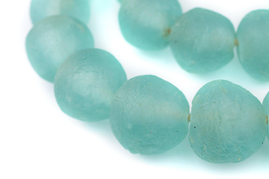 These exceptionally large dark aqua-colored recycled glass beads are handmade in Ghana. Large beads such as these are hard to find and even harder to find in good condition. The journey from Africa can sometimes be unkind to such large beads! These beads are sure to make an impression wherever they go. Use them as centerpieces for special jewelry, as adornments for interior design, or even as a wall hanging to decorate your favorite room. You will receive a 32" strand with approximately 23 beads. Recycled glass beads are a type of indigenously produced African bead from Ghana West Africa. These special beads are made using an old method that has been used for centuries. The glass itself is derived from a variety of recycled sources including old beverage and medicine bottles. The procedure for making the beads consists of a number of steps whereby powdered glass is poured into molds of clay and baked in a specialized oven. These beads are produced in large part by the Krobo tribe and are environmentally friendly. Some beads may have chips or internal fractures due to long journey. Shade of aqua may vary slightly from strand to strand.