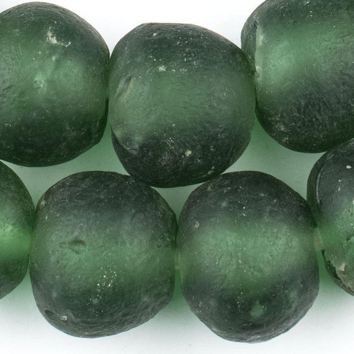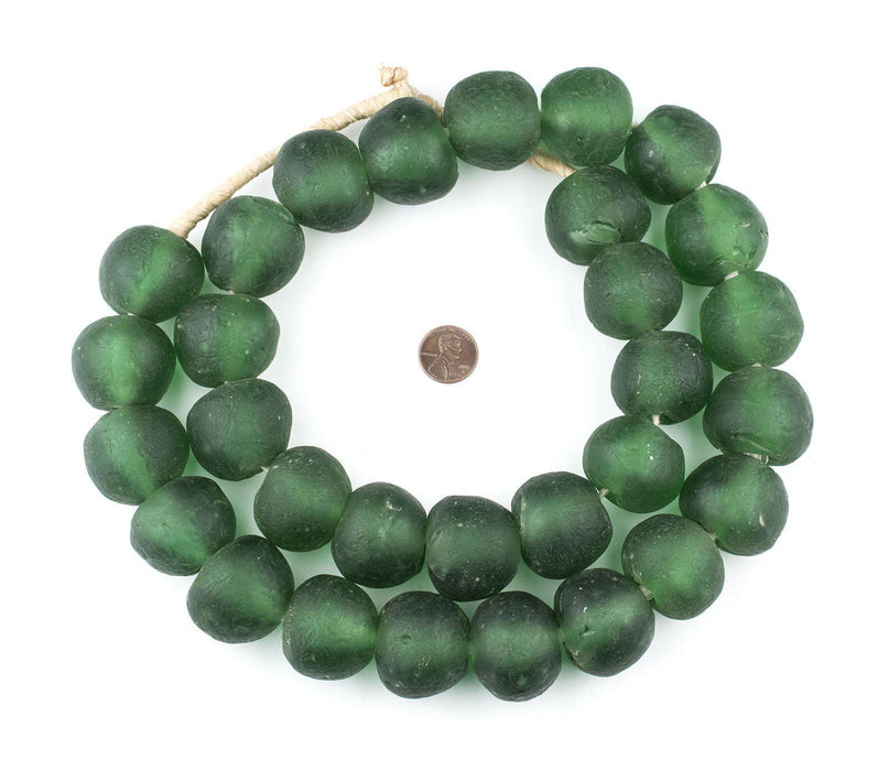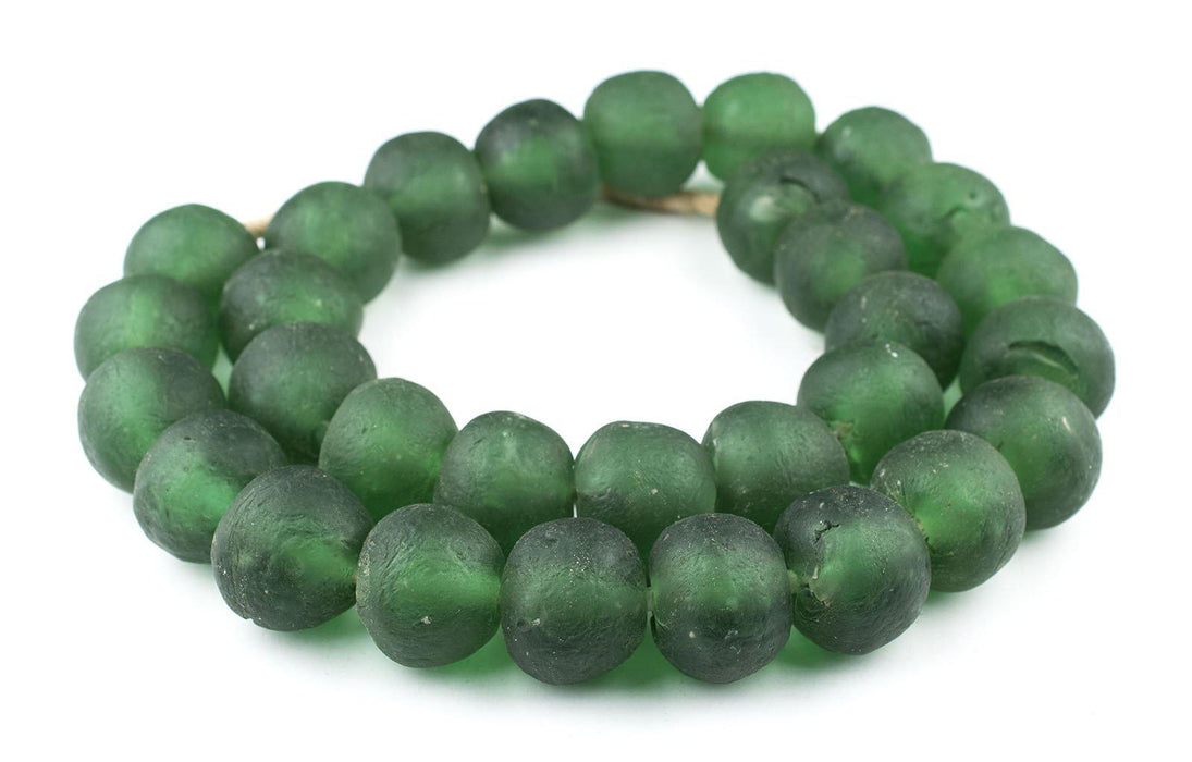 Take a look at this exceptionally large strand of jumbo-sized green recycled glass beads. Large beads such as these are hard to find and even harder to find in good condition. The journey from Africa can sometimes be unkind to such large beads! This strand is sure to make an impression wherever it goes. Use these beads as centerpieces for special jewelry, as adornments for interior design, or even as a wall hanging to decorate your favorite room. You will receive a 33" strand with approximately 24 beads. Each strand is unique and may vary slightly from strand pictured.