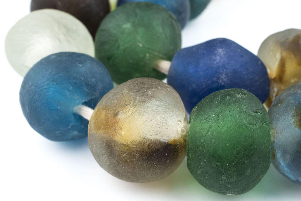 Recycled glass beads are a type of indigenously produced African bead from Ghana West Africa. These special beads are made using an old method that has been used for centuries. The glass itself is derived from a variety of recycled sources including old beverage and medicine bottles. The procedure for making the beads consists of a number of steps whereby powdered glass is poured into molds of clay and baked in a specialized oven. These beads are produced in large part by the Krobo tribe and are environmentally friendly. Because of the size of these beads, it is not uncommon for a strand to have a few beads with internal fractures. Non-USA buyers, please note that a heavy-weight surcharge may apply for this item. Please inquire in advance if you would like to pre-confirm this fee.