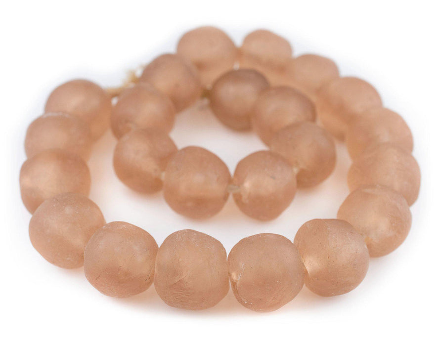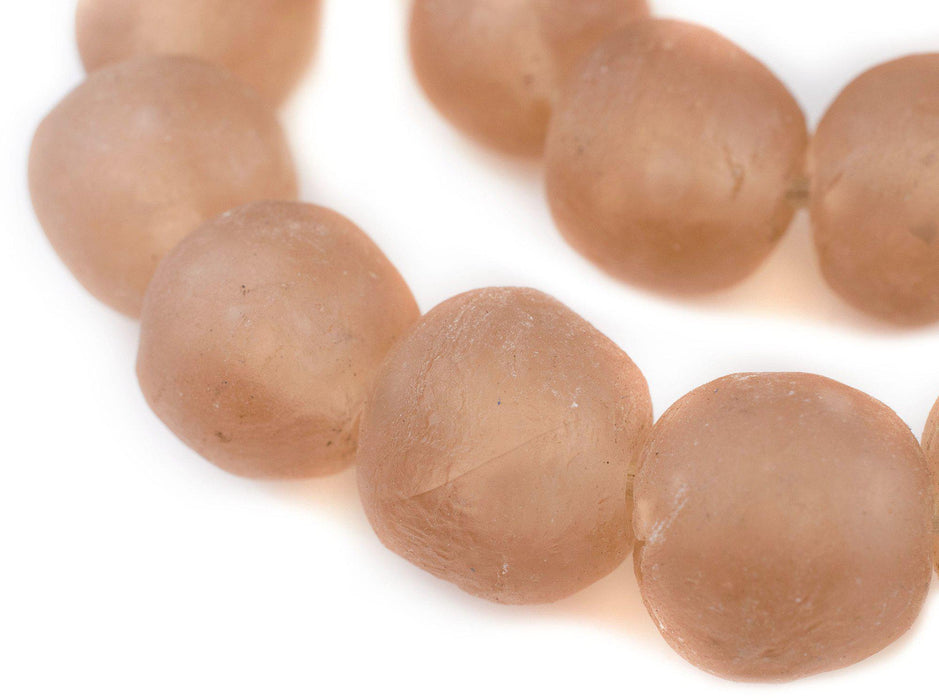 Take a look at this exceptionally large strand of jumbo-sized rose color recycled glass beads. Large beads such as these are hard to find and even harder to find in good condition. The journey from Africa can sometimes be unkind to such large beads! These beads are sure to make an impression wherever they go. Use them as centerpieces for special jewelry, as adornments for interior design, or even as a wall hanging to decorate your favorite room. You will receive a 28" strand with approximately 23 beads. Recycled glass beads are a type of indigenously produced African bead from Ghana West Africa. These special beads are made using an old method that has been used for centuries. The glass itself is derived from a variety of recycled sources including old beverage and medicine bottles. The procedure for making the beads consists of a number of steps whereby powdered glass is poured into molds of clay and baked in a specialized oven. These beads are produced in large part by the Krobo tribe and are environmentally friendly. Some beads may have chips or internal fractures due to long journey. Non-USA buyers, please note that a heavy-weight surcharge may apply for this item. Please inquire in advance if you would like to pre-confirm this fee.