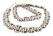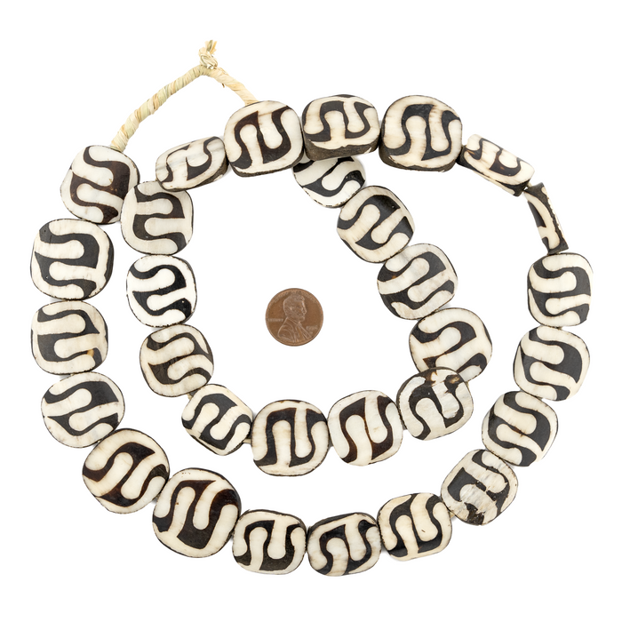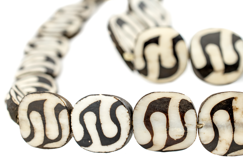 These beads are made of bone and come from Kenya, Africa. The design is created through a dying method known as "batik", which is a wax relief process. The beads are strung on sisal and are often worn as is. The strand is over 24" long, and each bead is about 20 mm in diameter.