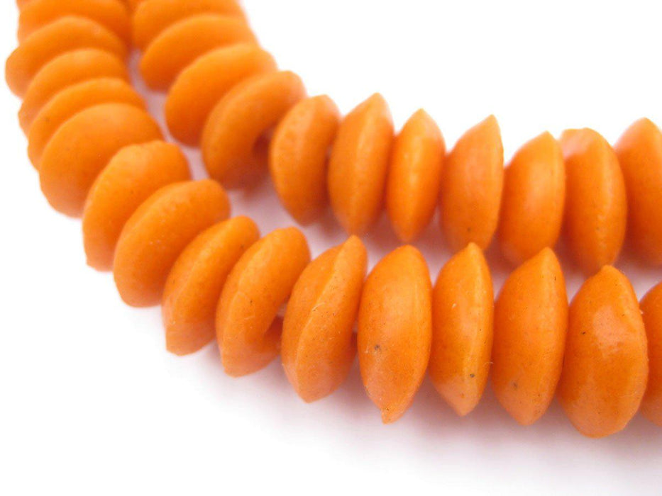 Checkout this beautiful strand of orange color Ashanti glass saucer beads. The process of making these beads is unique to Africa and has been used for over 1000 years. Pulverized glass of various colors is poured into a clay mold, using a cassava stem for the bead's hole. The mold is placed in a furnace and heated until the glass particles congeal without actually melting and the stem burns out. The Ghanaians have been making beads in this manner since the 1600s. Shade of orange may vary slightly from photo. Each bead measures approximately 14mm in diameter.