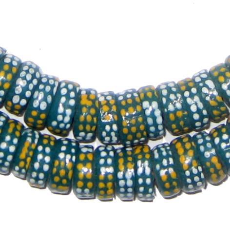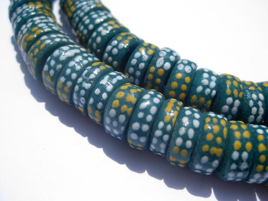 A beautiful strand of powder glass African beads, made by the people of Krobo Mountain (Ghana, West Africa), reproducing old Venetian FANCY trade beads. Made from bottles and other glass items that are turned into powder, then poured into molds in order to create beads that resemble old Aja trade beads. Decorations on the beads are made with a paste made of colored glass powder and water, which is applied using a thin wooden stalk. They are cooked a second time to fix the decor. The beads are handmade.