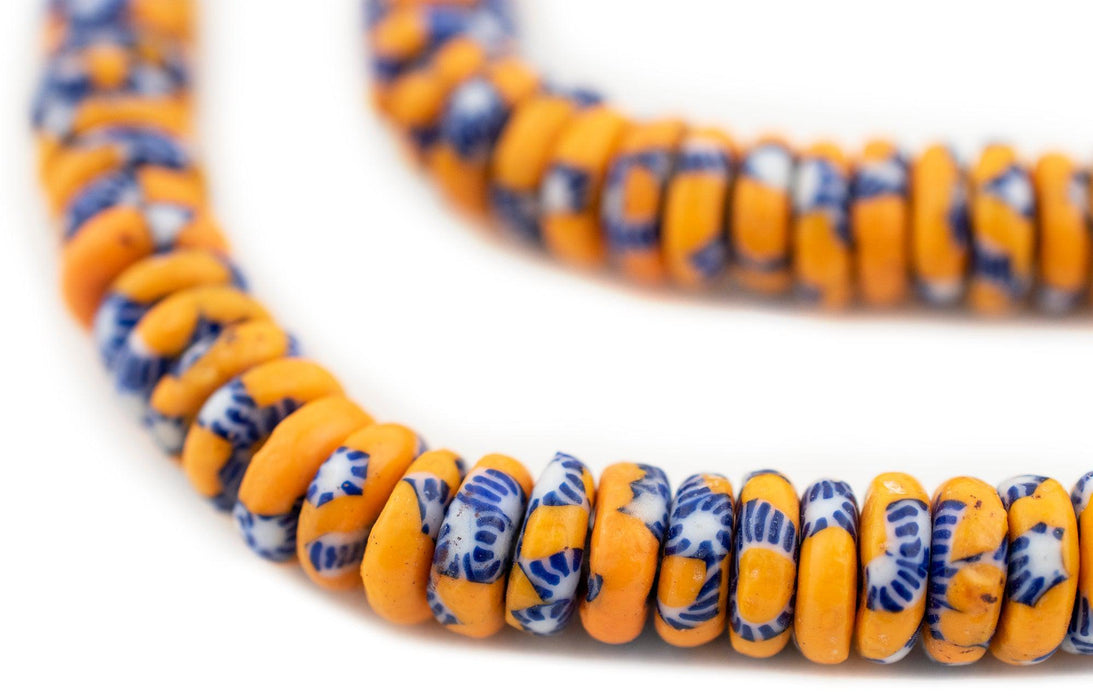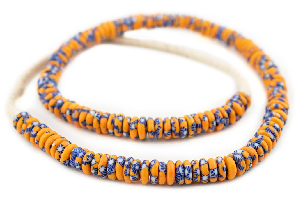 This uniquely patterned strand of rondelle beads is made using traditional methods used to create powder glass beads. The procedure for making the beads consists of a number of steps whereby powdered glass is poured into molds of clay and baked in a specialized oven. Individual beads measure 3-4 x 10-11mm and have a hole size of approximately 2-3mm. You will receive a full strand measuring approximately 24".