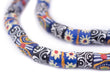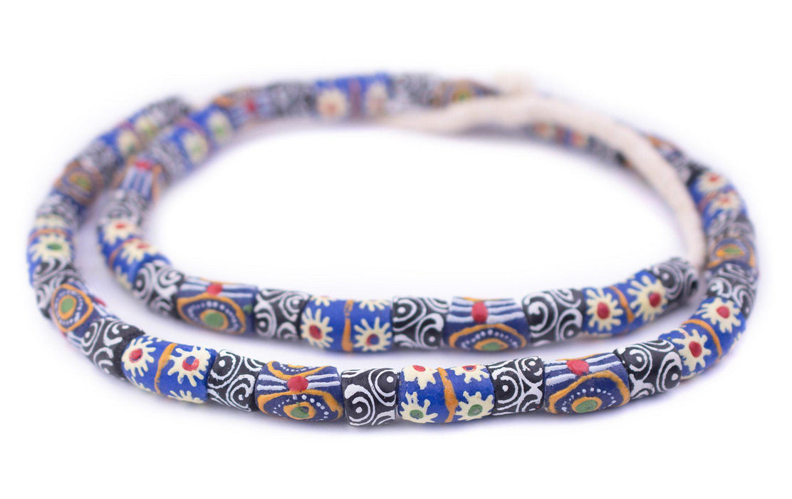 This beautiful strand of African powder glass beads was made by the people of Krobo Mountain in Ghana, West Africa. Many designs of Krobo beads are patterned to resemble old Venetian fancy trade beads. They are made from bottles and other glass items that are turned into powder, then poured into molds in order to create beads. Decorations on the beads are made with a paste made of colored glass powder and water which is applied by hand using a thin wooden stalk. The beads are cooked a second time to fix the decor. Each bead measures approximately 11-22 x 11-12mm with a hole size of approximately 3mm. You will receive a full strand measuring approximately 26".