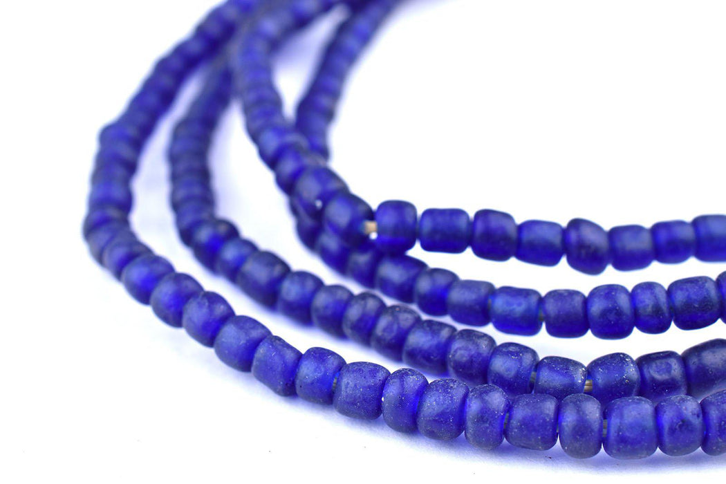 Two strands of translucent cobalt blue colored small glass beads from Ghana. Each bead measures approximately 3 x 4mm with strand length of 25". Some variation in individual beads is shown as pictured. Use these as spacers or mix and match colors to express your unique style!