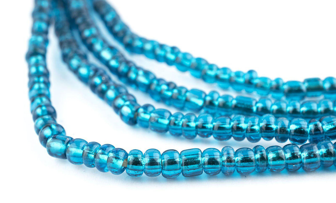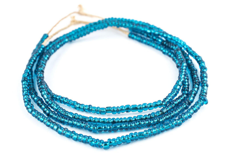 Beautiful strand of translucent teal glass seed beads from Ghana. Each bead measures approximately 3-4 x 4mm with strand length of 26". Some variation in individual beads is shown as pictured. Use these as spacers or mix and match colors to express your unique style! Two strands pictured. Each strand sold individually.