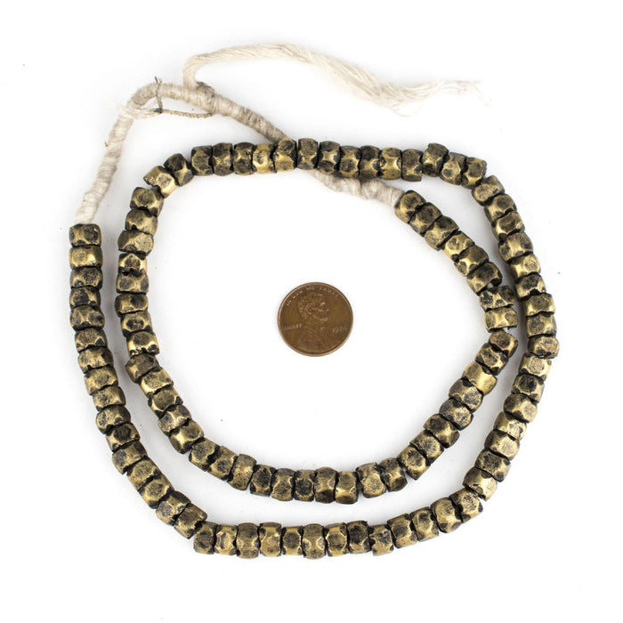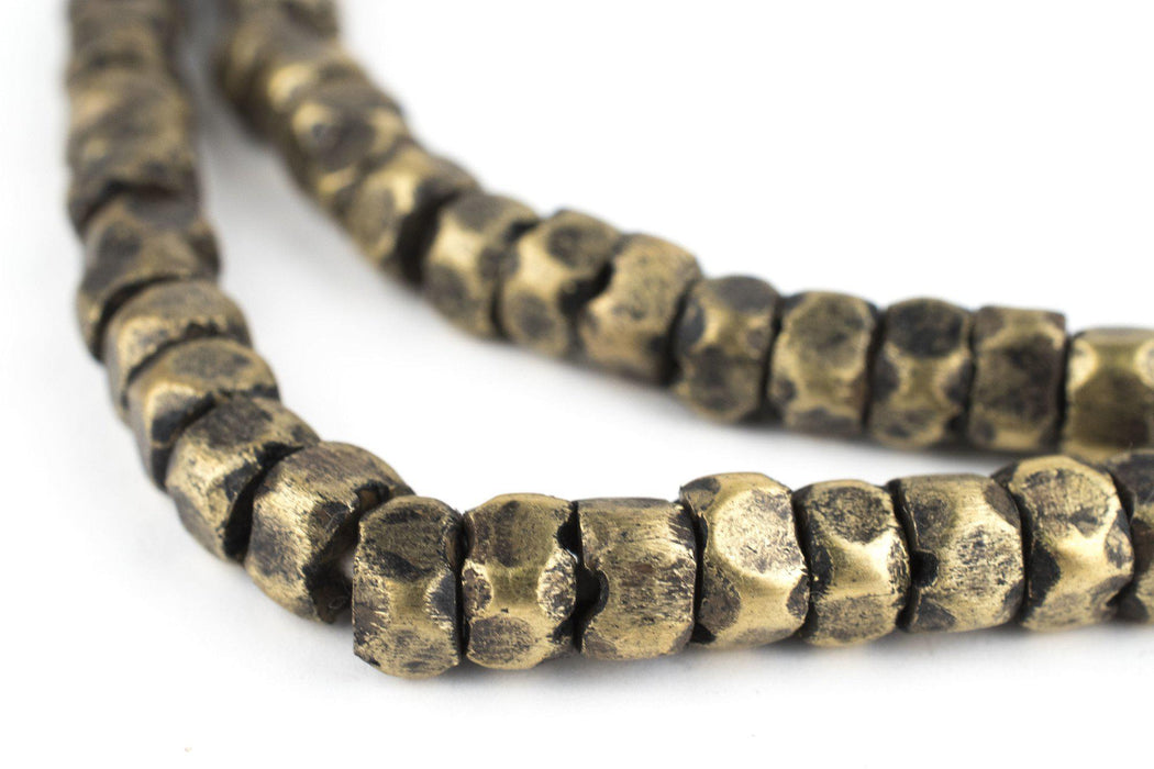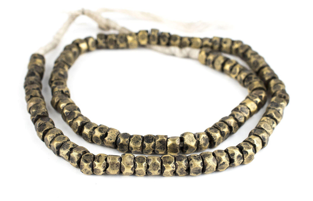 Admire these exceptional cube-like beads crafted by the Tuareg people of Mali in West Africa. The Tuareg are a desert tribe that inhabit a large swathe of North and West Africa including parts of the Sahara. This shape is a traditional design that is particular to Tuareg jewelry. These solid brass beads have a vintage finish and a nice heavy feel to them. Each bead measures approximately 5 x 8mm in diameter with about 100 beads on a string. Hard to find.