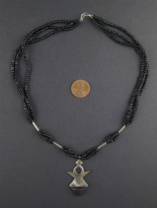 This beautiful pendant was handcrafted in Niger West Africa by the Tuareg people. Each pendant features traditional designs and may include the Milky Way, Berber Cross, Southern Cross, Shooting Star or other motifs. This pendant measures 40-60mm and is made with ebony wood. Pendants may show some signs of wear. This pendant has been strung with beads and clasp. Wear the necklace 'as-is' or remove pendant and include as a centerpiece in your own personal design!