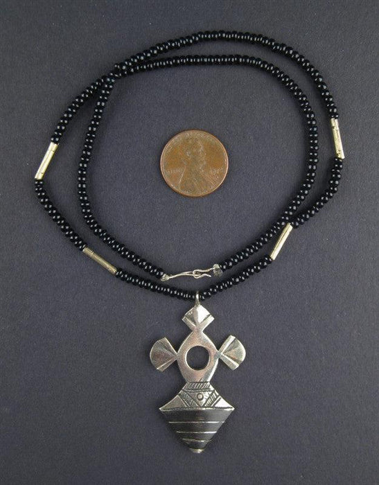 This beautiful pendant was handcrafted in Niger West Africa by the Tuareg people. Each pendant features traditional designs, measures 40-60mm in length and is made with ebony wood. Pendants may show some signs of wear. This pendant has been strung with beads and clasp. Wear the necklace 'as-is' or remove pendant and include as a centerpiece in your own personal design! This pendant is unique so you will receive the pendant that is pictured.