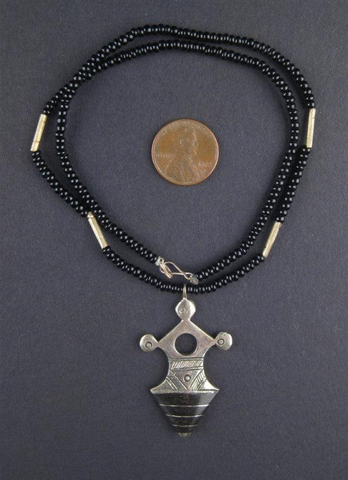 This beautiful pendant was handcrafted in Niger West Africa by the Tuareg people. Each pendant features traditional designs, measures 40-60mm in length and is made with ebony wood. Pendants may show some signs of wear. This pendant has been strung with beads and clasp. Wear the necklace 'as-is' or remove pendant and include as a centerpiece in your own personal design! This pendant is unique so you will receive the pendant that is pictured.