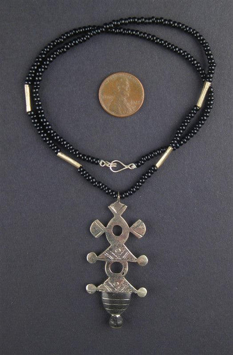 This beautiful pendant was handcrafted in Niger West Africa by the Tuareg people. Each unique pendant features traditional designs made with ebony wood and measures 40-60mm in length. Pendants may show some signs of wear. This pendant has been strung with beads and clasp. Wear the necklace 'as-is' or remove pendant and include as a centerpiece in your own personal design! You will receive the pendant that is pictured.