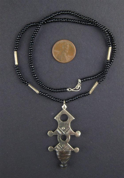 This beautiful pendant was handcrafted in Niger West Africa by the Tuareg people. Each unique pendant features traditional designs made with ebony wood and measures 40-60mm in length. Pendants may show some signs of wear. This pendant has been strung with beads and clasp. Wear the necklace 'as-is' or remove pendant and include as a centerpiece in your own personal design! You will receive the pendant that is pictured.