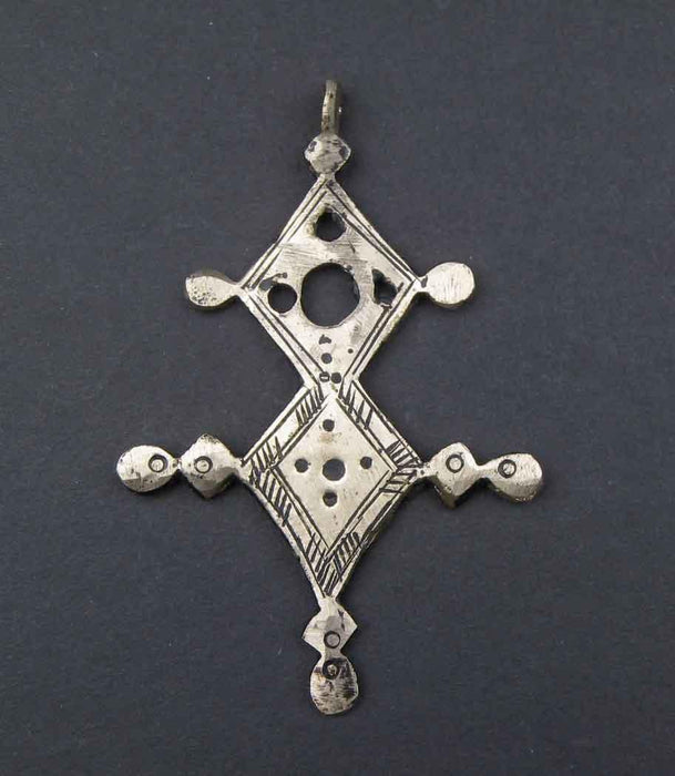 This handmade Tuareg pendant was made in Southern Morocco. Each pendant features traditional designs and may include the Milky Way, Berber Cross, Southern Cross, Shooting Star or other motifs. This pendant measures approximately 55x85mm. Pendant may show some signs of wear or minor variation from design pictured.