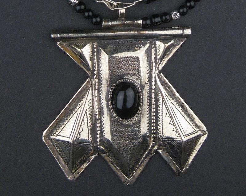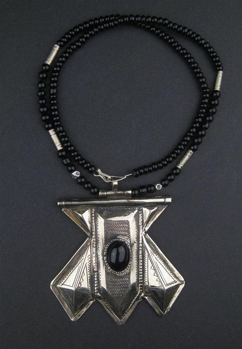This beautiful pendant was handcrafted in Niger West Africa by the Tuareg people. Each pendant features traditional designs, measures 65-90mm across and is made with natural stone. This pendant has been strung with beads and clasp. Wear the necklace 'as-is' or remove pendant and include as a centerpiece in your own personal design! You will receive the exact pendant pictured.