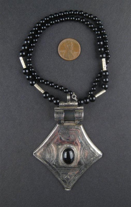 This beautiful pendant was handcrafted in Niger West Africa by the Tuareg people. Each pendant features traditional designs, measures 65-90mm across and is made with natural stone. This pendant has been strung with beads and clasp. Wear the necklace 'as-is' or remove pendant and include as a centerpiece in your own personal design! You will receive the exact pendant pictured.