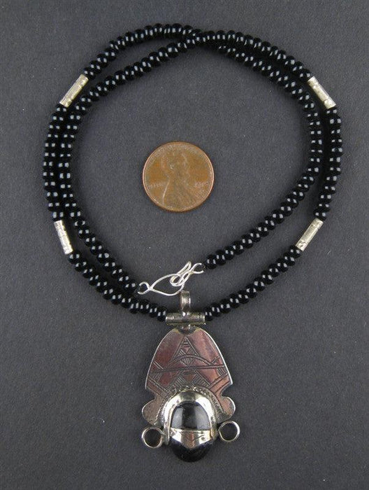 This beautiful pendant was handcrafted in Niger West Africa by the Tuareg people. Each pendant features traditional designs, measures 40-65mm in length and is made with natural stone. This pendant has been strung with beads and clasp. Wear the necklace 'as-is' or remove pendant and include as a centerpiece in your own personal design! You will receive the exact pendant pictured.