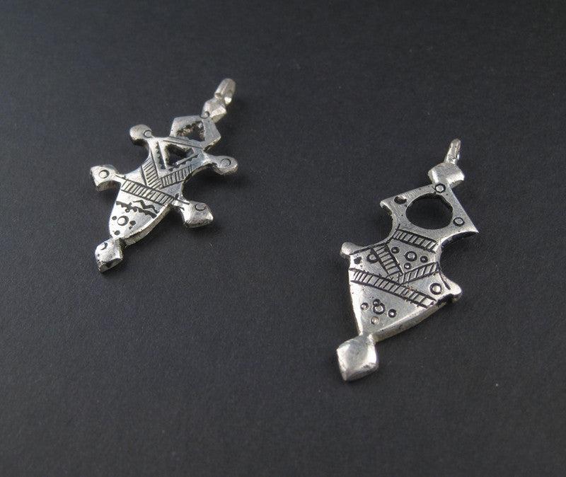 These handmade Tuareg pendants were made in Southern Morocco. Each set of pendants features traditional designs and may include the Milky Way, Berber Cross, Southern Cross, Shooting Star or other motifs. The pendants measure 45-60mm in length. Pendants may show some signs of wear and are sold as a set of two. You will receive the exact pendants pictured. Take advantage of this great deal!