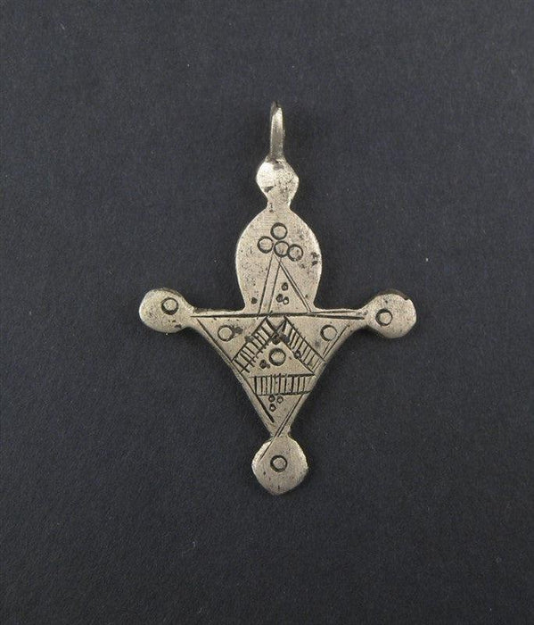 This handmade Tuareg pendant was made in Southern Morocco. Each pendant features traditional designs and may include the Milky Way, Berber Cross, Southern Cross, Shooting Star or other motifs. This pendant measures 26x50mm. Pendants may show some signs of wear.