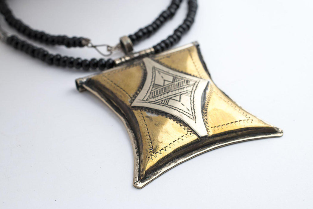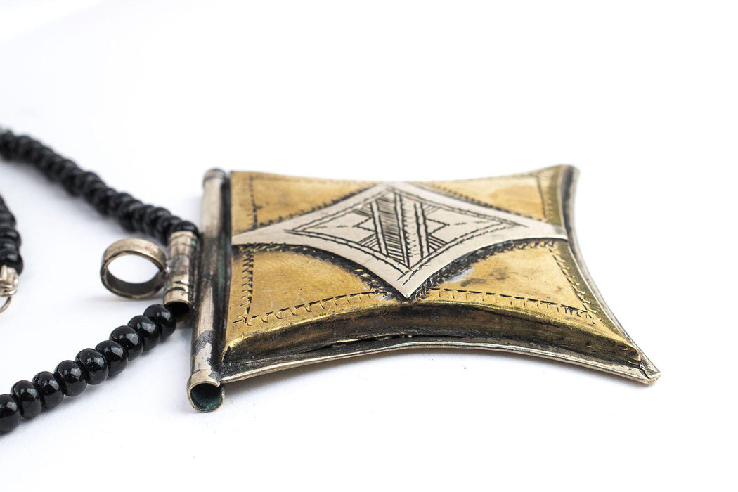 This beautiful protective amulet was handcrafted in Niger West Africa by the Tuareg people. It features traditional designs and measures approximately approximately 50 x 36-52mm. The amulet has been engraved with traditional motifs. Wear the necklace 'as-is' or remove the amulet and include as a centerpiece in your own personal design!