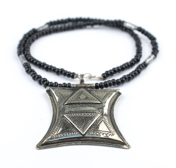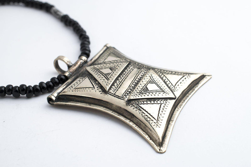 This beautiful protective amulet was handcrafted in Niger West Africa by the Tuareg people. It features traditional designs and measures approximately approximately 48 x 35-49mm. The amulet has been engraved with traditional motifs. Wear the necklace 'as-is' or remove the amulet and include as a centerpiece in your own personal design!