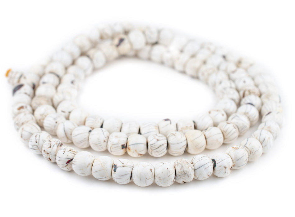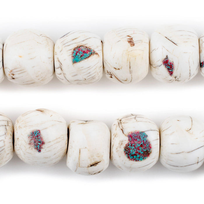 Looking for some special beads? These are them! These smooth beads have been inlaid with crushed coral and turquoise stone to fill small gaps and crevices in the shell. The unique finish of these beads give them a truly unique feel. Look carefully and you can appreciate the detail. These beads come strung in 108-bead mala form plus a centerpiece bead as well. Each strand measures approximately 60" long, and each bead is about 13-14 x 16-17mm. Extra long strand great as a wall hanging or for home decor. Each strand is unique and may differ slightly from picture.