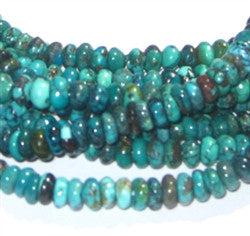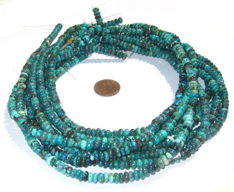 Don't let these beautiful handmade turquoise beads pass by you. Beads are very rich in color and measure 5mm in diameter about 3mm thick, and the strand is about 16 inches long. Picture shows a bunch of strands. Price is for one only There is approximately 125-130 beads per strand. These beads are hand cut.
