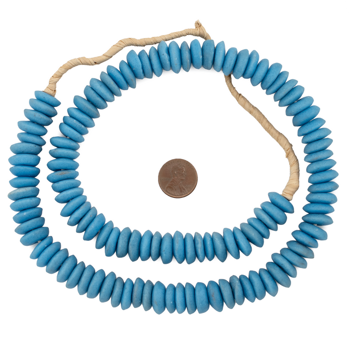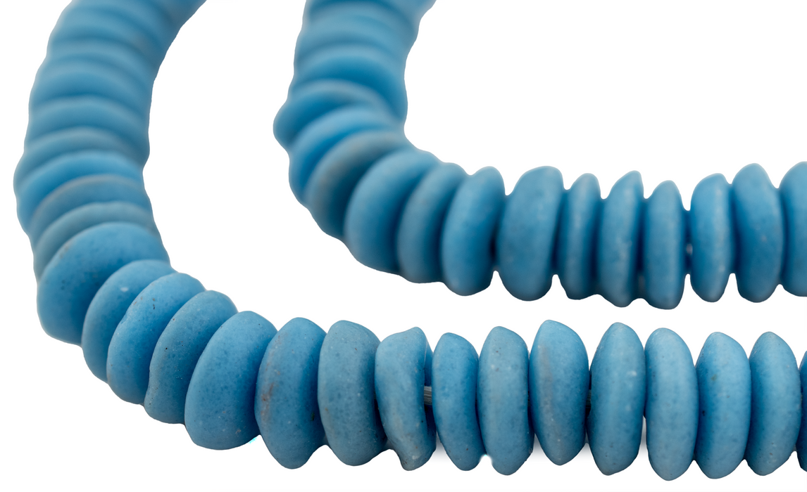Checkout this beautiful strand of turquoise blue color Ashanti glass saucer beads. The process of making these beads is unique to Africa and has been used for over 1000 years. Pulverized glass of various colors is poured into a clay mold, using a cassava stem for the bead's hole. The mold is placed in a furnace and heated until the glass particles congeal without actually melting and the stem burns out. The Ghanaians have been making beads in this manner since the 1600s. Each bead measures approximately 14mm in diameter.
