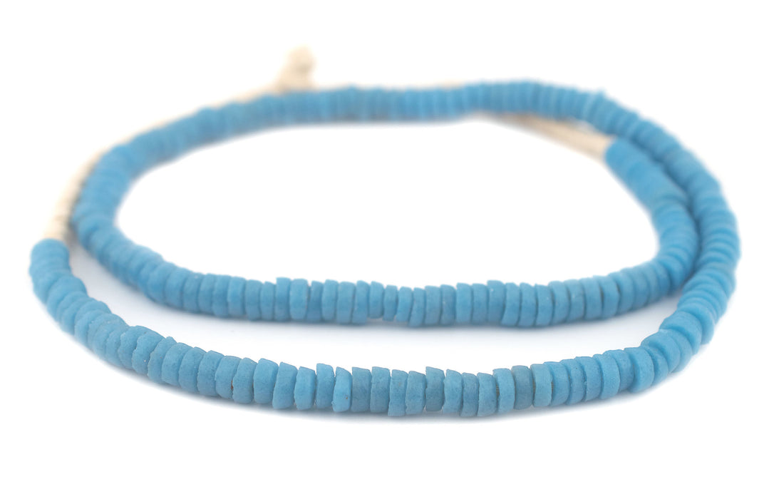 Checkout this beautiful strand of blue color Ghana glass disk beads. The process of making these beads is unique to Africa and has been used for over 1000 years. Pulverized glass of various colors is poured into a clay mold, using a cassava stem for the bead's hole. The mold is placed in a furnace and heated until the glass particles congeal without actually melting and the stem burns out. The Ghanaians have been making beads in this manner since the 1600s. Each bead measures approximately 3.5 x 7mm, with holes measuring approximately 2mm.