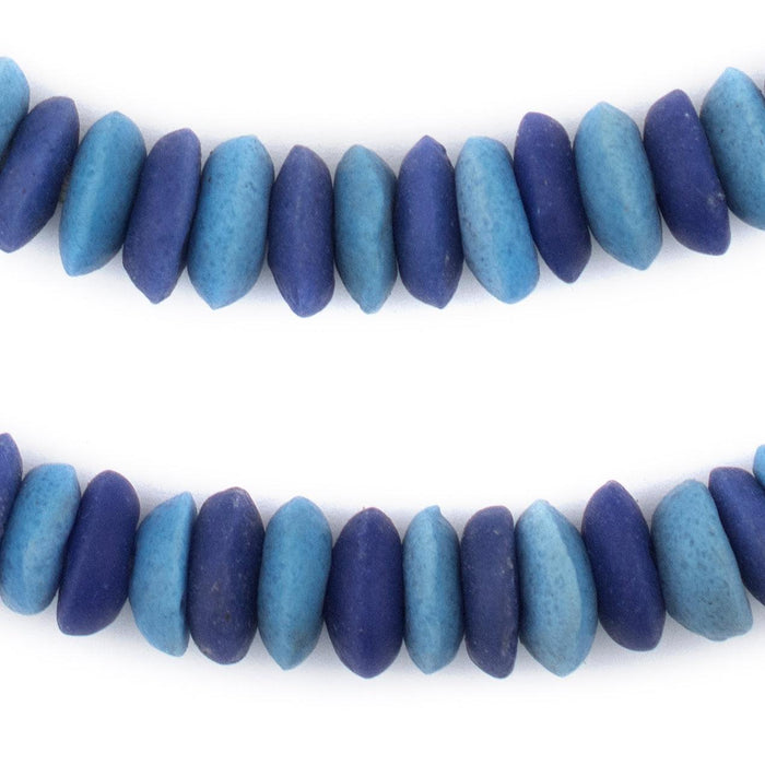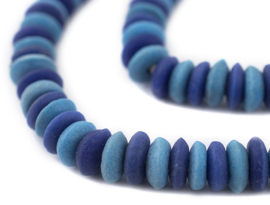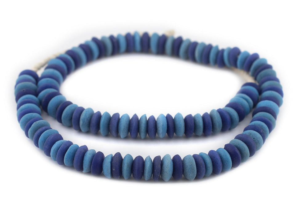 Checkout this beautiful strand of blue medley Ashanti glass saucer beads. Get multiple colors for the price of one! The process of making these beads is unique to Africa and has been used for over 1000 years. Pulverized glass of various colors is poured into a clay mold, using a cassava stem for the bead's hole. The mold is placed in a furnace and heated until the glass particles congeal without actually melting and the stem burns out. The Ghanaians have been making beads in this manner since the 1600s. Each bead measures approximately 4-6 x 12-14mm with a hole size of approximately 3mm. You will receive a full strand measuring approximately 30".