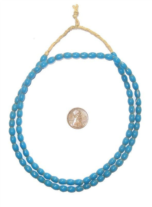Interesting african beads made from glass in shape of rice grains. Brilliant blue color beads measure 5mm diameter by 8mm long.