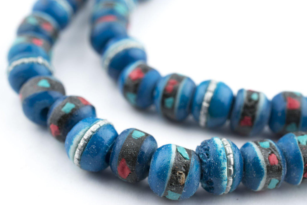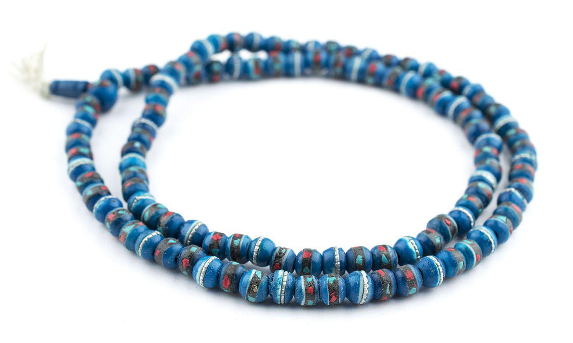 Take a look at this colorful strand of handmade prayer beads made from bone and strung as a 108-bead mala. Each long strand is approximately 26" long, and the beads measure about 6-7 x 7-8mm. Individual beads have been inlaid with brass, turquoise or coral color bits. Another great strand of beads to add to your collection!