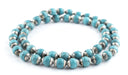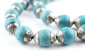 Admire this great strand of turquoise stone beads. Each bead is made by setting a round stone between two silver caps engraved with a patterned motif. Turquoise stone has been treasured since time immemorial as a protective talisman. Interestingly, it derives it's name in the English language from the Turks who were the first to introduce it to the Western World. The striking detail of these beads is apparent in the careful workmanship. Each bead measures approximately 12mm long by 8mm in diameter. Highly versatile for your creative jewelry projects, these beads may be used in bracelets, earrings, necklaces, and more!