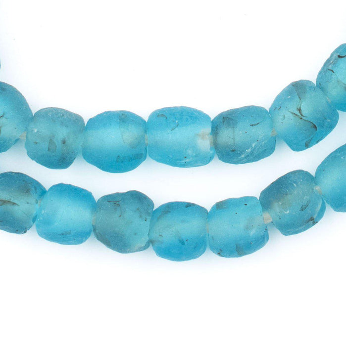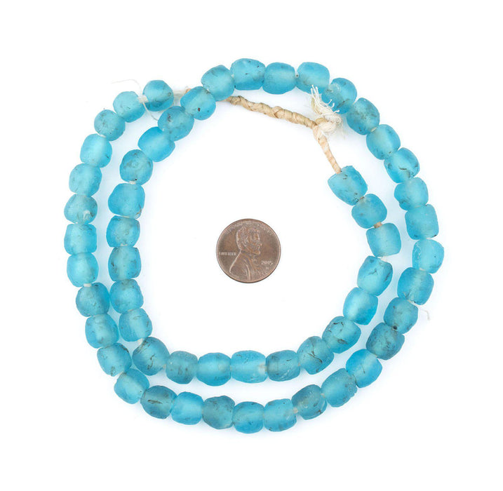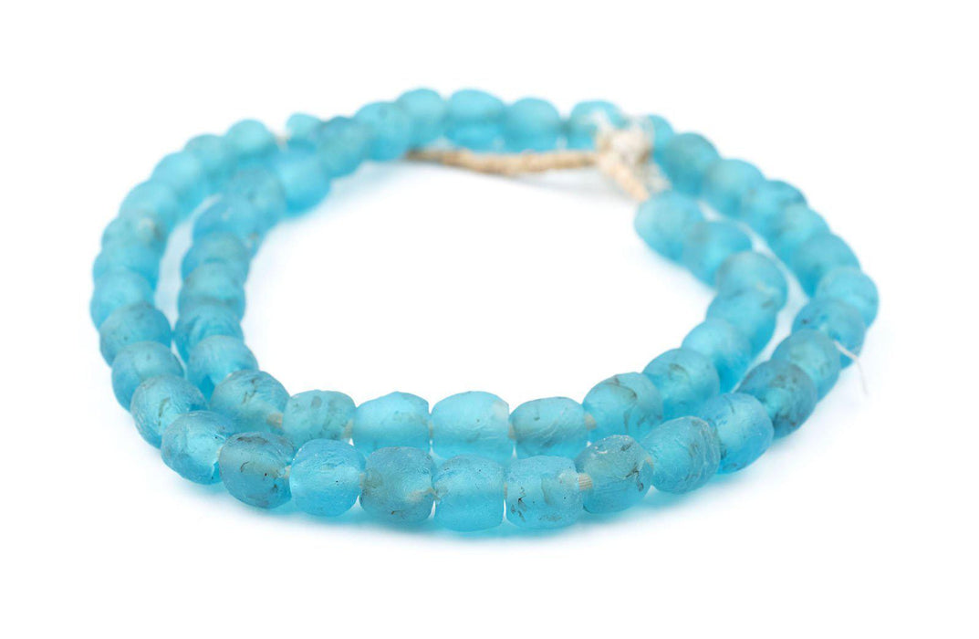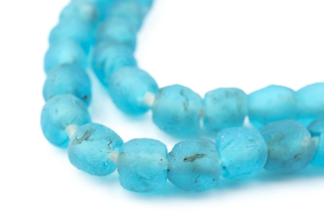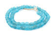 Admire this beautiful strand of recycled glass beads in a highly rare turquoise color! Recycled glass beads are a type of indigenously produced African bead from Ghana West Africa. These beautiful blue color recycled beads are made using an old method that has been used for centuries. The glass itself is derived from a variety of recycled sources including old beverage and medicine bottles. The procedure for making the beads consists of a number of steps whereby powdered glass is poured into molds of clay and baked in a specialized oven. These beads are produced in large part by the Krobo tribe and through recycling glass are environmentally friendly.