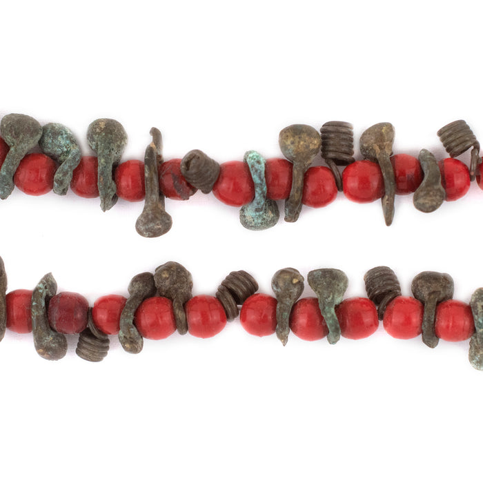 Take a look at these unusual antique brass trade beads from Nigeria West Africa. Also known as Cambari brass, each bead is handmade individually. Strand is approximately 24-26" including raffia, with beads measuring approximately 3-5 x 5-13mm. The strand has approximately 180 beads total including red and brass beads. Each strand is unique and may vary slightly from photo.