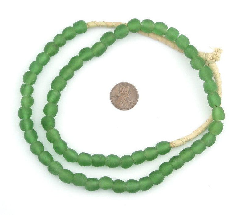 Beautiful strand of Ghana recycled glass beads in a green color. Recycled glass beads are a type of indigenously produced African bead from Ghana West Africa. These beautiful recycled beads are made using an old method that has been used for centuries. The glass itself is derived from a variety of recycled sources including old beverage and medicine bottles. The procedure for making the beads consists of a number of steps whereby powdered glass is poured into molds of clay and baked in a specialized oven. These beads are produced in large part by the Krobo tribe and through recycling glass are environmentally friendly.