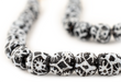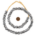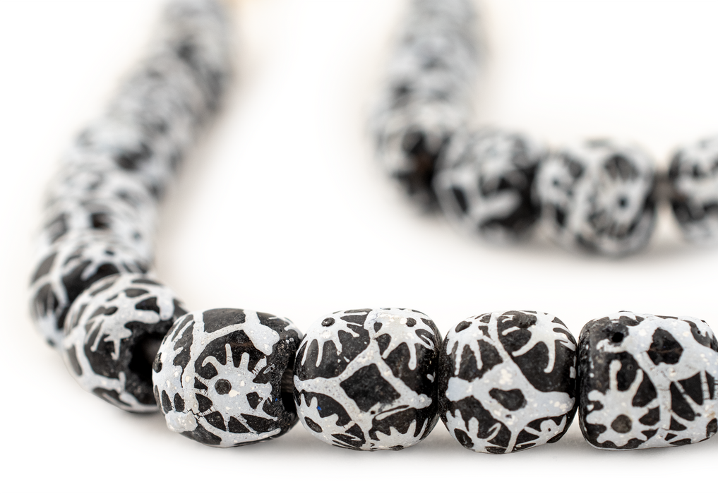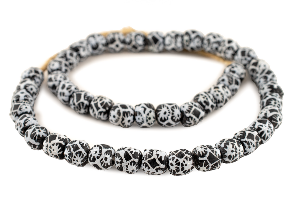 A beautiful strand of powder glass African beads, made by the people of Krobo Mountain (Ghana, West Africa), reproducing old Venetian FANCY trade beads. Made from bottles and other glass items that are turned into powder, then poured into molds in order to create this nice looking drum shaped beads. Decorations on the beads are made with a paste made of colored glass powder and water, which is applied using a thin wooden stalk. They are cooked a second time to fix the decor. The beads are handmade.