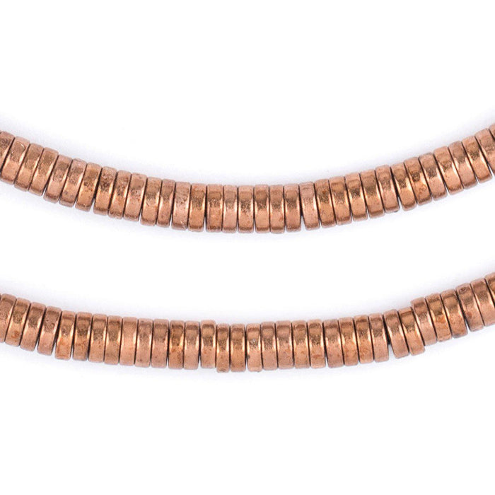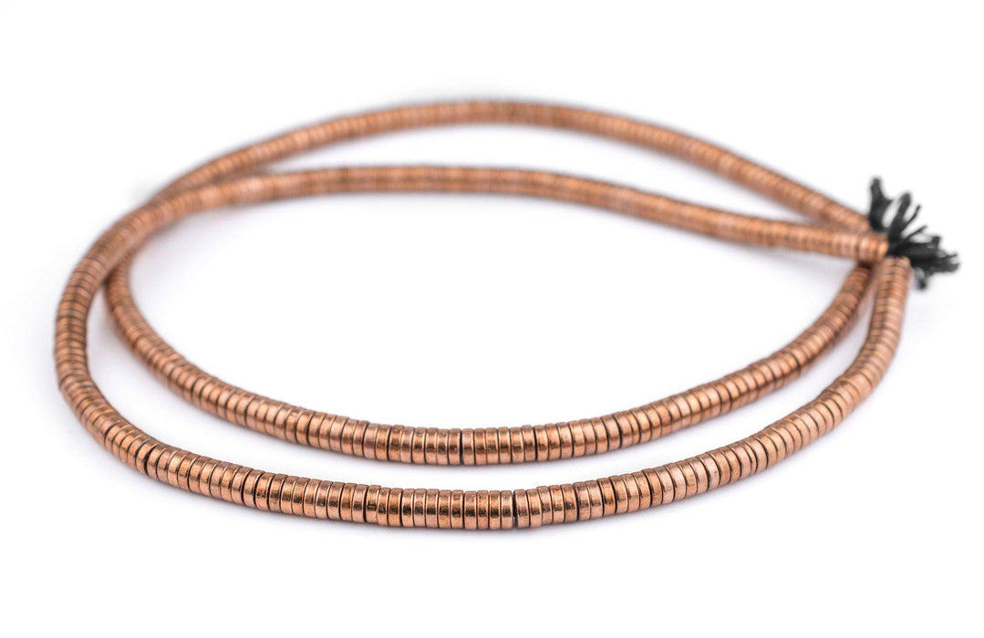 Take a look at this great strand of brass beads fashioned in a disk shape. Each strand is 16" inches long with approximately 200 beads measuring 2 x 6mm. These great beads are highly versatile and may be used as spacers or accents in your unique designs. A great addition to your beading toolkit! Multiple strands pictured. Each strand sold individually. This artisan product is made using premium copper electroplating over brass to make these copper finish customer favorites.