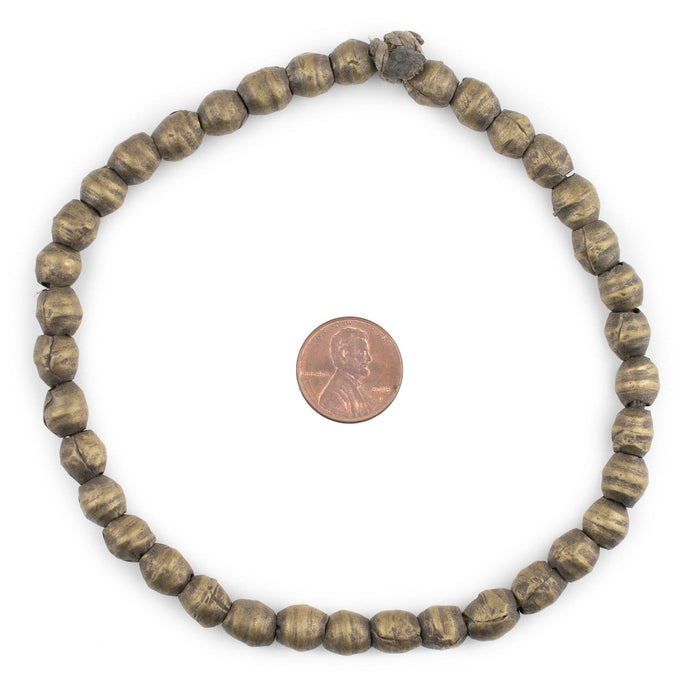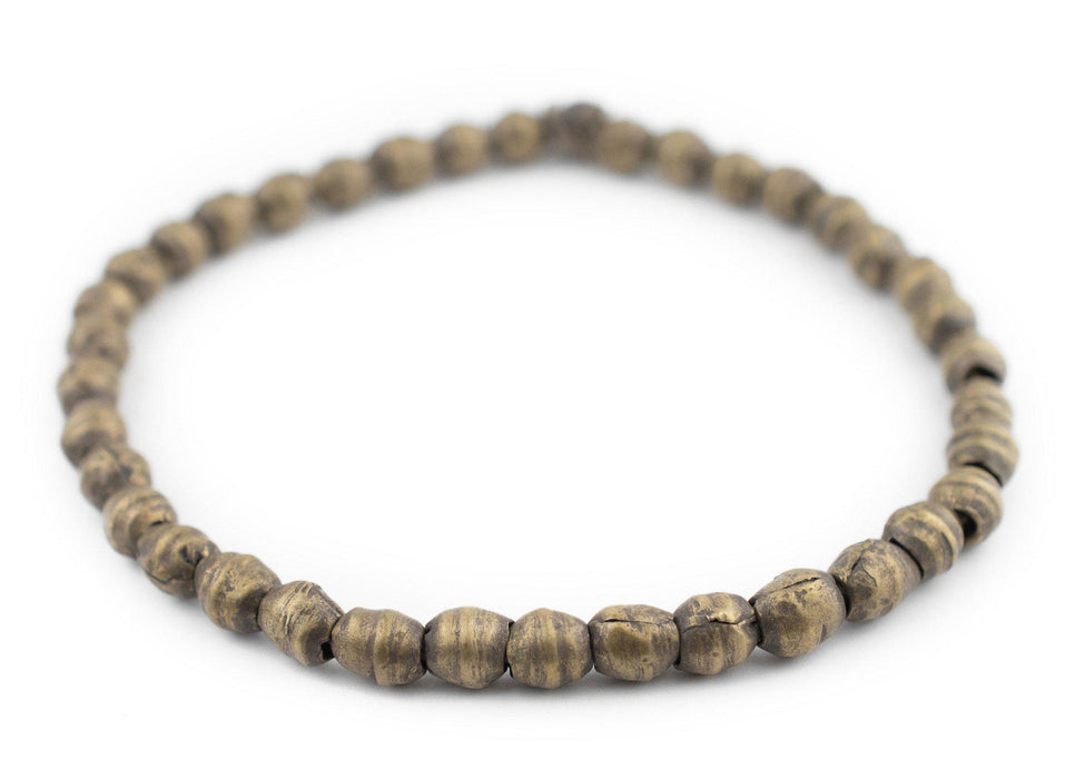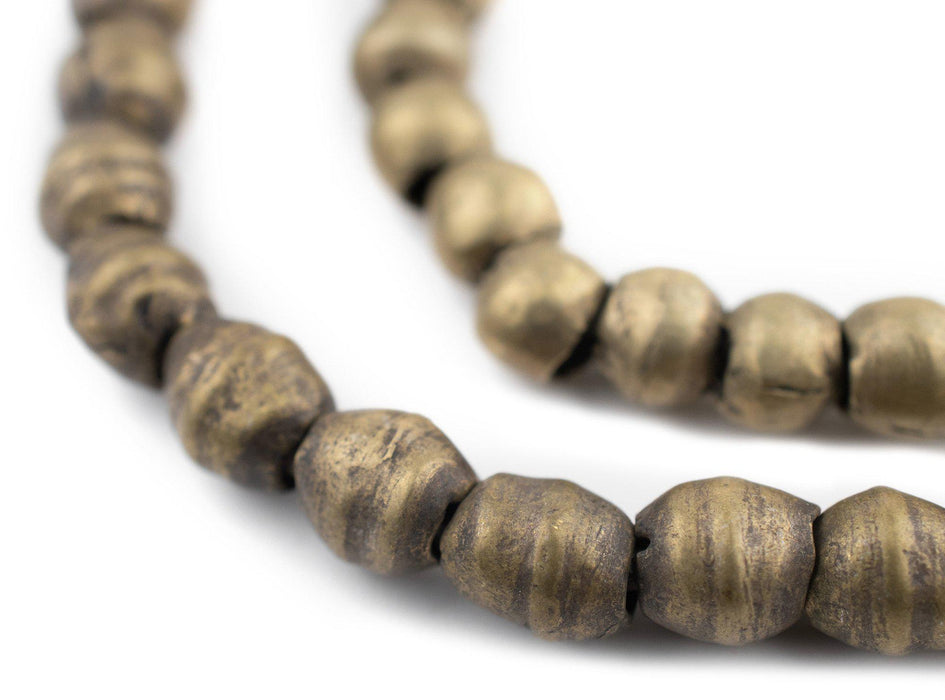 This beautiful strand of brass beads are old in age and rich in character. Sourced from the Ethiopian countryside, these special beads have surely passed through many hands before making their way to us. Fashioned in a traditional padre shape, beads such as these are often times used as rosaries in traditional Ethiopian circles. Each bead measures approximately 7-10 x 7-8mm in size, with a large hole size of 3-4mm. Each strand is approximately 12 inches in length. We've been collecting these hard-to-find beads for years, but we've finally decided it's time to part ways. Get yours while you can! Limited supply available. There is variation in size and shape of beads between strands.