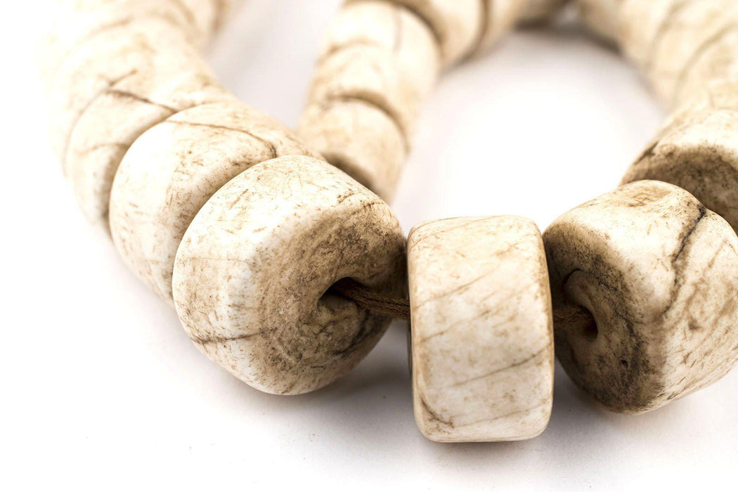 Admire the detail of these unusual beads fashioned in a cylinder-like shape from the natural shell of the ocean conch. The material for these unique beads is said to have been traded from the Bay of Bengel north towards the Himalayan mountains. No two beads are alike however beads measure approximately 12-13 x 12-19mm with hole size of 2mm. The length of strand measures about 21". Each strand is unique and may vary slightly from photo. Beads may be used in your own special jewelry design however the beads have been nicely strung and the strand may also easily be worn as a necklace.