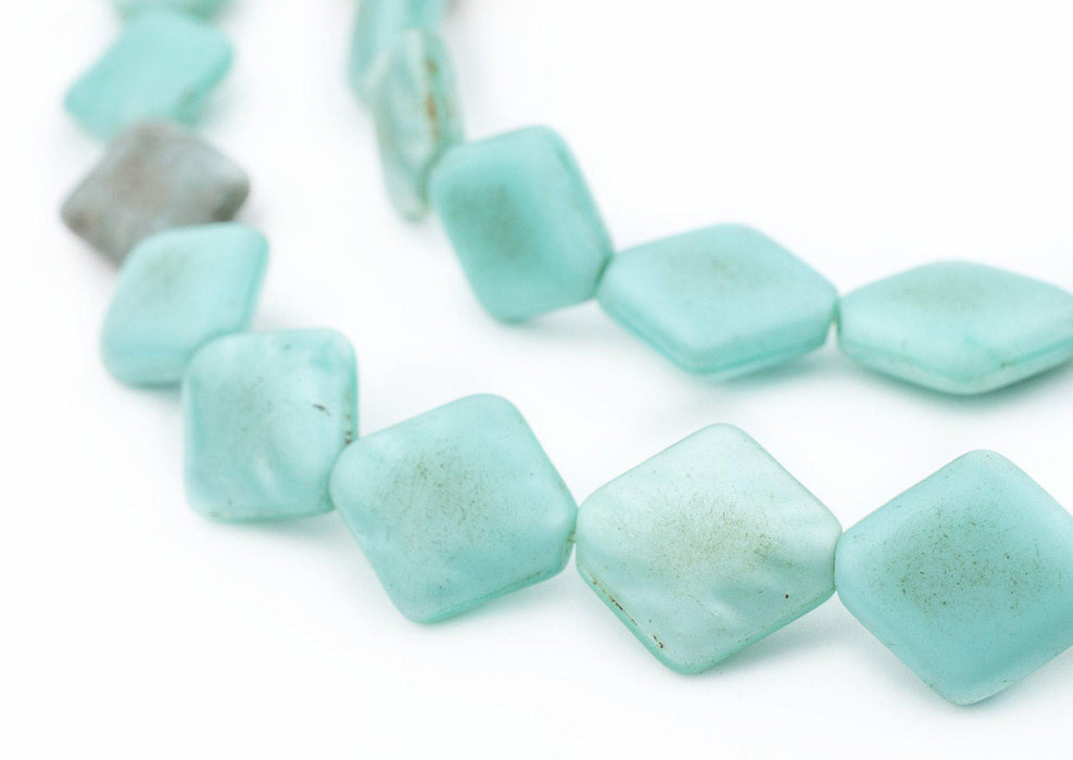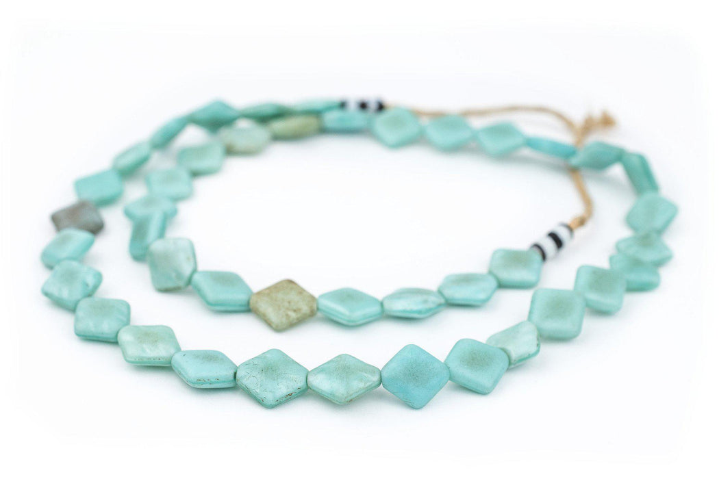 These unusual vintage glass beads have a unique pearl-like finish. Found in Nigeria but likely a rare variety of Czech Prosser beads, these beauties have a special time-worn quality to them. Each flat diamond-shaped bead measures approximately 16mm from hole to hole and 15mm in the transverse direction. The beads have been strung on a durable nylon cord with a traditional raffia finish at the top. A few beads are chipped or broken due to age. May be worn as is or as part of your personal jewelry creations. This is a unique strand and you will receive the exact strand pictured.