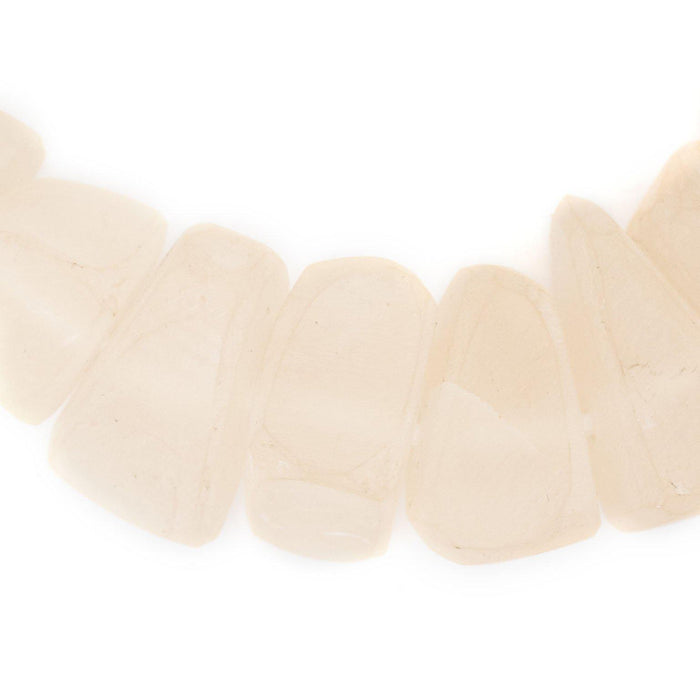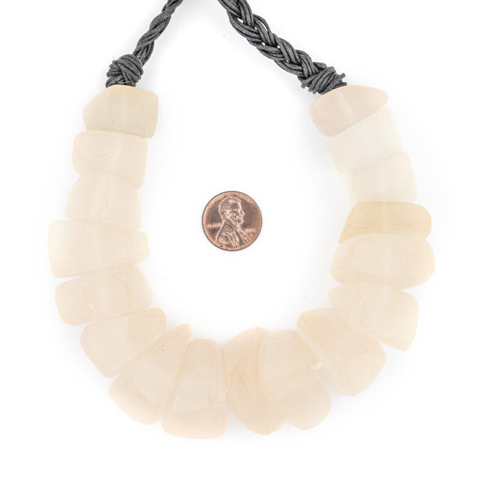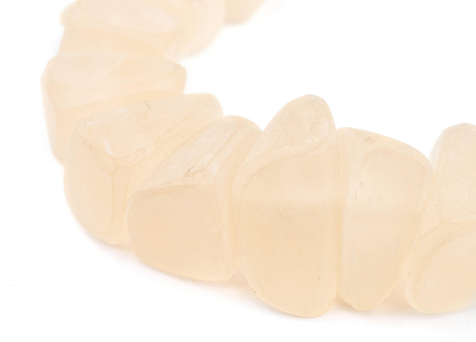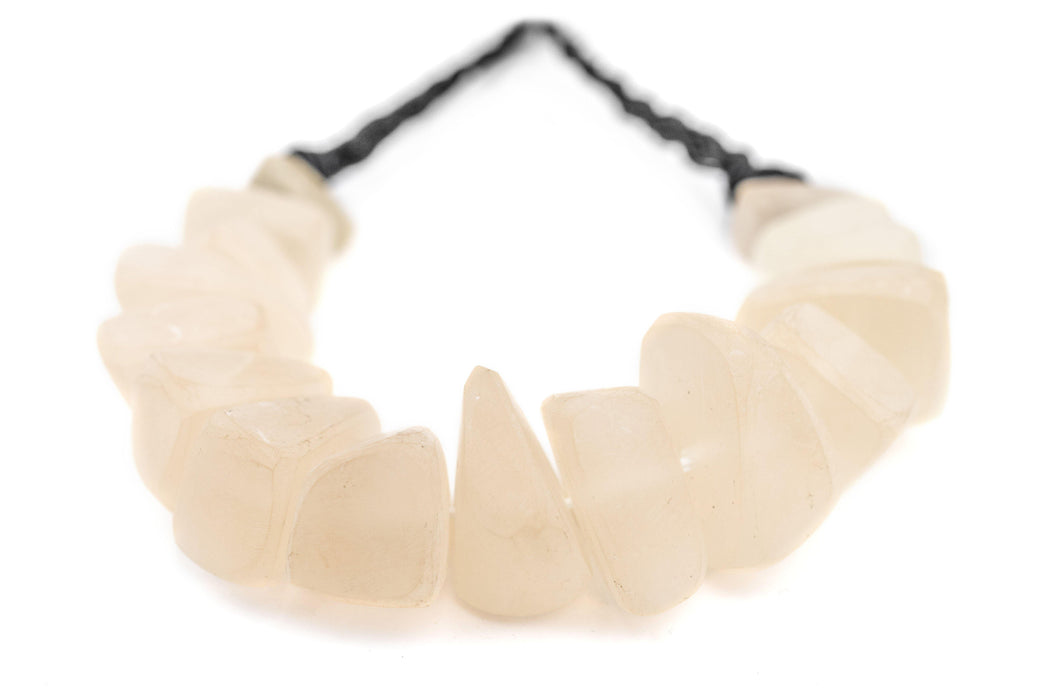 These unusual semi-translucent Moroccan resin beads have been fashioned to resemble frozen chunks of ice crystals. Get the look of ice crystals without the weight and without the cold! Individual chunks measures 25-35mm long and 12-17 mm thick. Each strand has approximately 10" of beads, and measures 18" in length including braided string. Each strand is unique, and color tone of beads may vary slightly from photo.