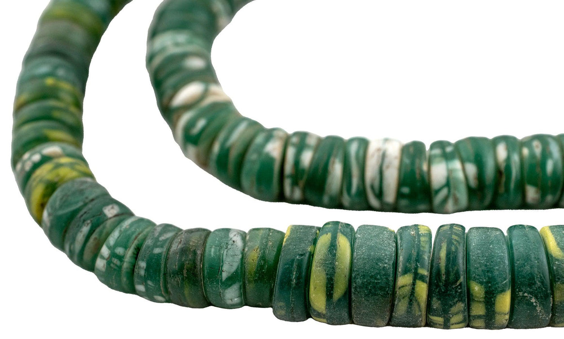The unique look of kakamba beads is easily recognized among the beads of Africa. Originally produced in former Czechoslovakia, these beads are made using a special process whereby glass is pressed in a mold. Also known as prosser beads, these fun vintage African trade beads come in a variety of different colors and combinations. Each strand is unique. You will receive the exact strand shown in the photo. Bead and strand dimensions are approximate and may vary slightly. Get yours today!
